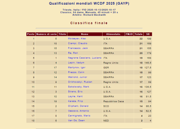 Si è concluso sabato 22 gennaio, il Campionato del Mondo 3-move con il successo dell’italiano Sergio Scarpetta (Cerignola, FG), detentore del titolo iridato, con 4 vittorie a 2 (e 24 pari) sullo sfidante Alex Moiseyev, ex sovietico naturalizzato statunitense ed ex campione mondiale.
