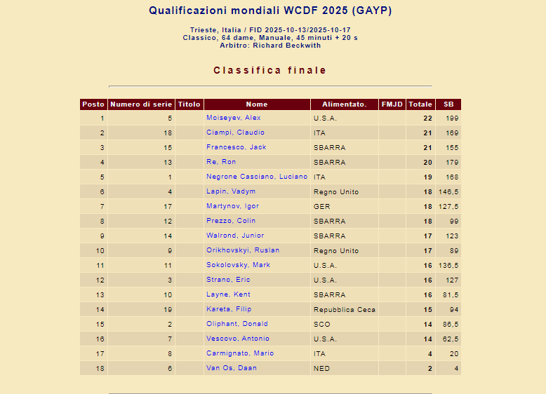 detiene adesso (nuovamente) entrambi i titoli iridati Checkers (dama inglese), considerata la conferma di Sergio Scarpetta a gennaio quale Campione del Mondo 3-move (prime tre mosse