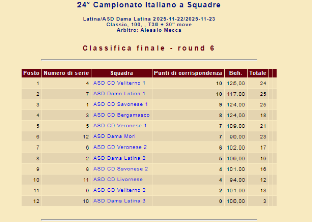 Classifica Finale gruppo 1-4: 1° ASD CD Veliterno (Roma) p. 5/ (Moscato W., Lucci M., D'Amora G.); 2° ASD Dama Latina 1 p. 4./ (Macali D., Senesi R., Salvato L.); 3° ASD CD Bergamasco Campagnola p. 3./ (Manzana M., Diop Aboubacar S., Gioffrè N.) ; 4° ASD Dama Mori p. 0./ (Cabral De Brito M., Agosti R., Celani W.)