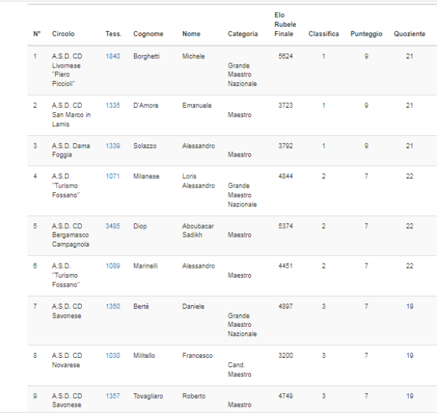 | Circolo | Cognome | Nome | Categoria | Classifica | Punteggio | Quoziente | Quoziente2 |