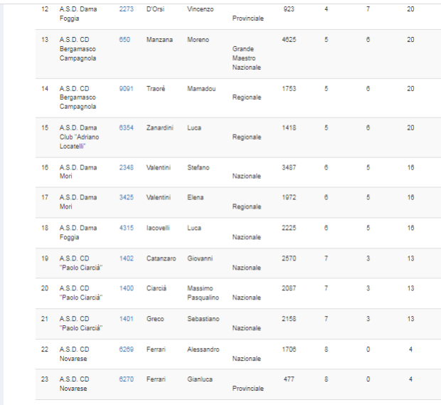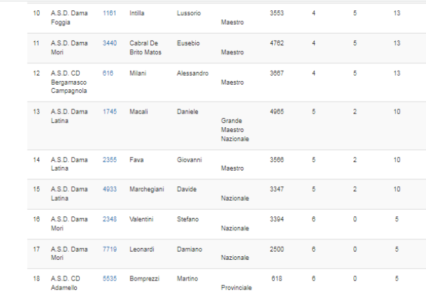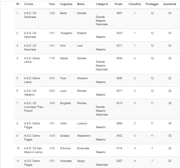 | A.S.D. Dama Latina | MACALI | Daniele | Grande Maestro Nazionale | 1° | 11 | 43 | 77 |