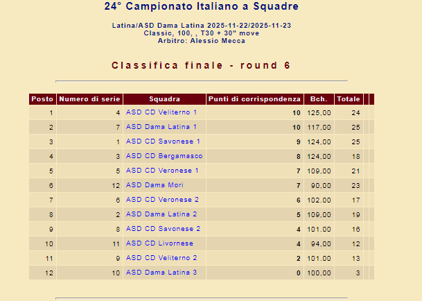 La squadra del CD Fossano ha così trionfato con 10 punti in classifica, precedendo il CD Latina, al 2° posto con 8 punti, grazie al Miglior quoziente sul CD Savonese, 3° sempre con 8 punti, mentre sempre a pari punti, ma peggior quoziente il CD Triestino è rimasto ai piedi del podio,4°. 5° posto per il Dama Foggia con 6 punti, come il CD Adamello (Trentino), ma miglior quoziente,7° il CD Bergamasco, 8° il CD Dama Mori (Trentino), 9° il CD Enrico Molesini Verona e 10° il CD Savonese 2.