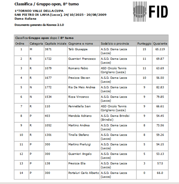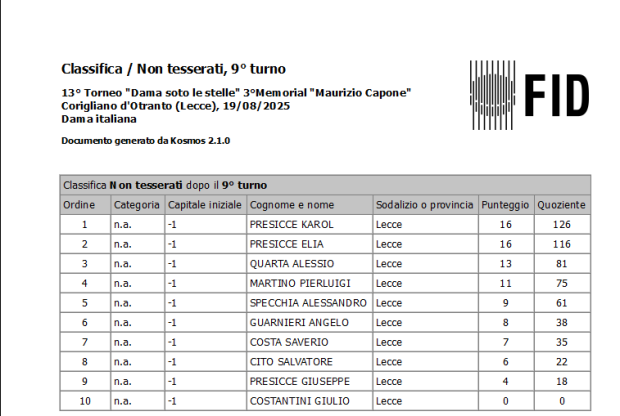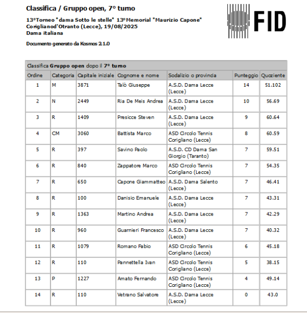 Nel 1° gruppo vince il Maestro leccese Giuseppe Talò a punteggio pieno, seguito da Andrea Ria De Meis con 10 pt; al terzo posto una delle giovani promesse del damismo Salentino Steven Presicce con 9 pt. Steven vince anche la coppa dedicata al nostro indimenticato amico "Memorial "Maurizio Capone" come miglior regionale (in gioco ne erano presenti ben 10). Nel Gruppo Ragazzi/Provinciali vince Karol Presicce dopo il testa a testa per tutto il torneo con il fratellino Elia (5 anni), 3°class Alessio Quarta di San Pietro in Lama. Tra i Provinciali il 1°classificato è Pierluigi Martino di San Pietro in Lama con punti 11. Ha diretto la gara Stefania Menga, arbitro dell'Asd dama Lecce. Come da tradizione la serata si è conclusa con una buona pizza.