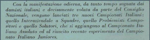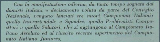 Nel 1961 sul damasport nr 12 viene pubblicato il 1°Campionato italiano Problemisti Compositori e Campionato Italiano Solutori.